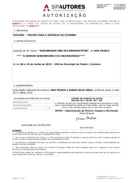 Autorização de uso da obra Biedermann Und Die Brandstifter de Max Frisch para a criação do espetáculo O Senhor Biedermann e Os Incendiários