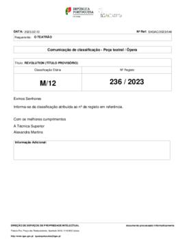 Atribuição de classificação etária para o espetáculo Revolution (título provisório). Foi atribuída a classificação 12 anos