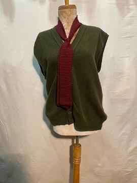 Colete verde e cachecol vinho utilizado como figurino para o ator David Meco