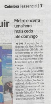 Recorte da notícia "Metro encerra uma hora mais cedo até Domingo", referente ao espetáculo "Com que Linhas te Cruzas, Parte 2 : A Viagem", publicada no Diário as Beiras no dia 11 de Setembro de 2025, na página 7.