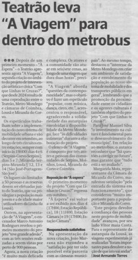 Recorte da notícia intitulada "Teatrão leva "A Viagem" para dentro do Metrobus", referente ao espetáculo "Com que Linhas te Cruzas, Parte 2 : A Viagem", publicada no Diário as Beiras no dia 29 de Agosto de 2025, na página 6.