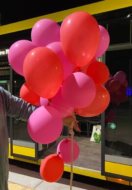 Balões em tons de rosa e vermelho, utilizados no final da cena do "Recrutador" e "Trabalhador" como símbolo da "nova vida" e da libertação do trabalhador, na criação "Com que Linhas te Cruzas, Parte 2 : A Viagem".