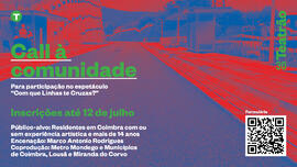 Banner de divulgação da call à comunidade: chamada para interessados em participar do espetáculo Com que Linhas te Cruzas